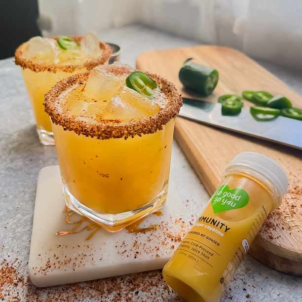 - In a shaker, combine the Immunity Shot, lime juice, 1-2 jalapeño slices and shot of tequila (if using)