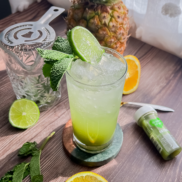 - Add the juice of half a lime, Detox Shot and coconut rum (optional) to a shaker with ice and shake well